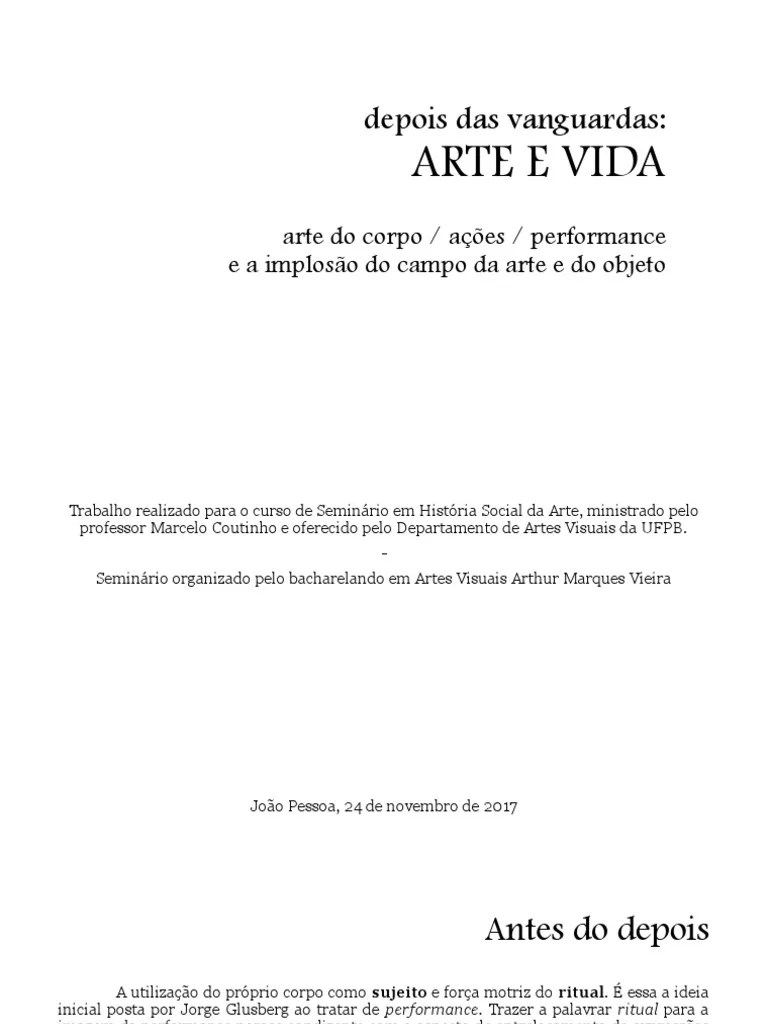 No início do século 20, quando as vanguardas européias passaram a questionar a arte produzida pela academia e, por que não dizer, questionar a própria arte, elas estavam iniciando um caminho que possibilitaria a... A performance é uma forma de arte que combina elementos do teatro, das artes visuais e da música.. Valéria peixoto de alencar*, especial para a página 3 pedagogia & comunicação.
